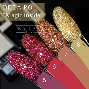 Серия камуфлирующих каучуковых баз MAGIC INSIDE с частичками разноцветной потали обладает усиленной адгезивной способностью, жесткостью и небольшой пластичностью.