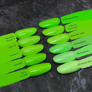 Гель-лак ярко-салатового цвета с эффектом свечения.