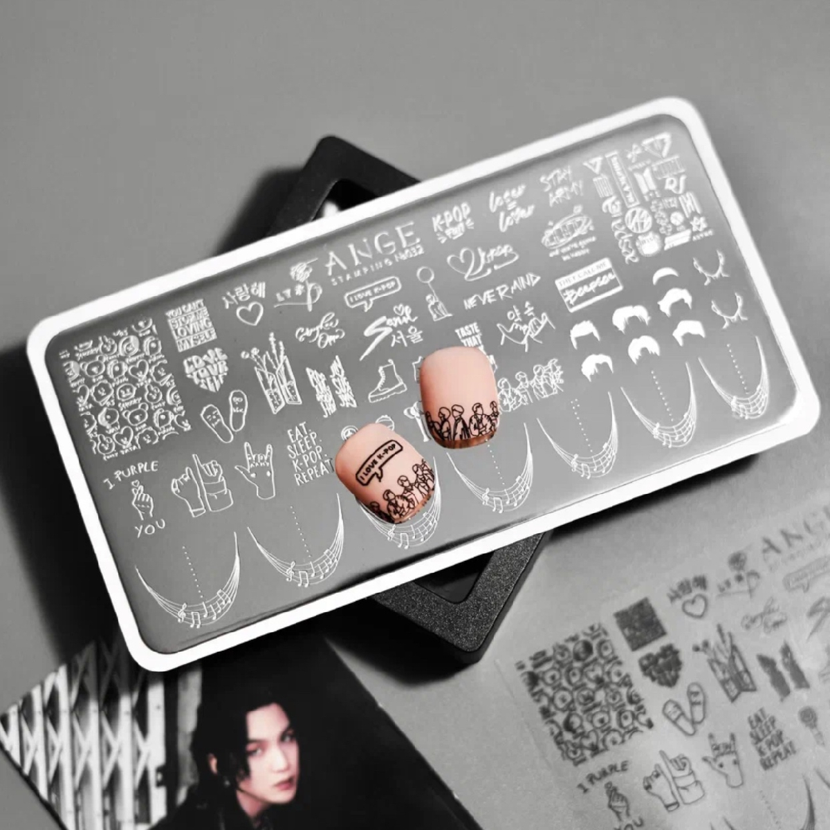 Теперь можно не только писать фанфики, собирать карточки и рисовать арты с любимыми мемберами, можно отпечатать их на ногтях! Вдохновляющие слова из знакомых песен, узнаваемые фанатами детали (все Арми знают, кому принадлежит тот ботинок), официальные логотипы популярных групп, а ещё — конструктор «собери своего айдола». И, конечно, френч с нотами одной из самых популярных песен — «Fantastic baby» от группы Big Bang.